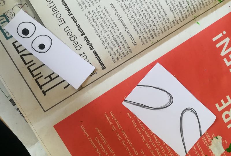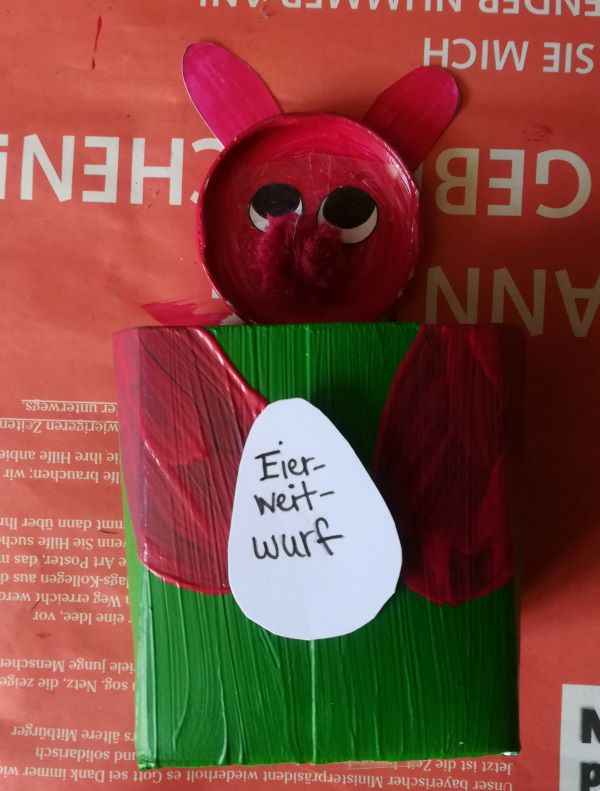 Während die Farbe trocknet, malen wir mit dem schwarzen Stift ein Paar Augen, ein Paar Ohren und ein Ei auf dem Eierweitwurf drauf geschrieben wird, auf ein weißes Papier. Die Ohren werden noch braun angemalt. |