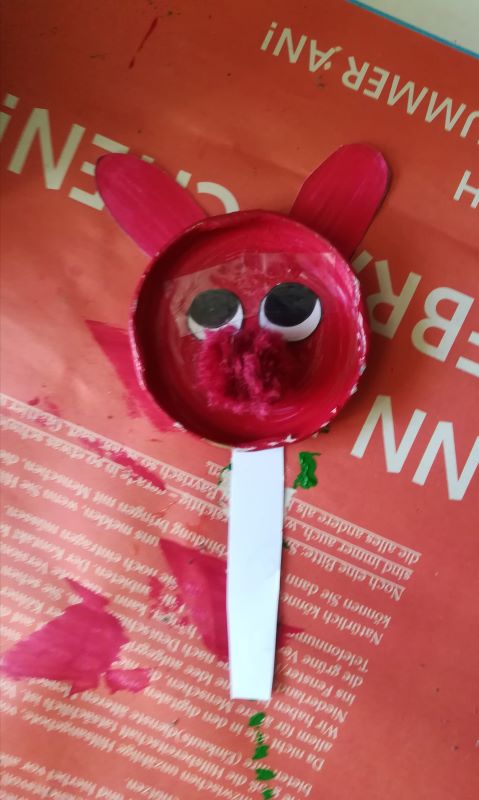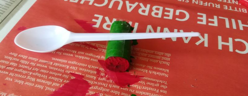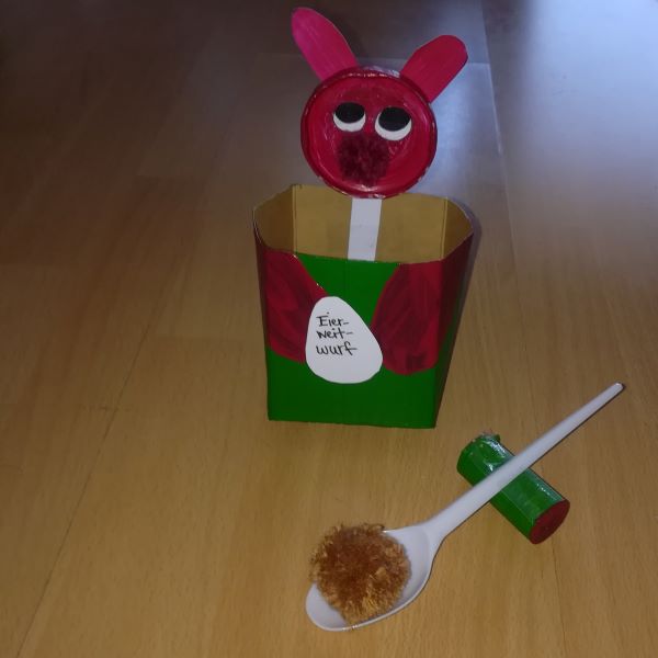 Du legst dafür einen Bommel in den Löffel und stellst das Löffel-Katapult ein Stück weiter weg vor dem Tetra Pak Hasen auf. Wenn du jetzt auf den Stiel des Löffels leicht drauf schlägst und Glück hast, fliegt der Bommel in die Öffnung des Tetra Paks hinein. Wenn es nicht gleich gelingt, musst du noch ein bisschen üben. |