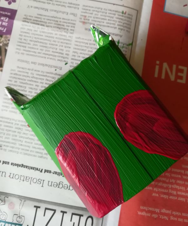 Was wir brauchen: – Ein halbes Tetra Pak (die untere Hälfte) – Einen Deckel – Farbe (Wassermalfarbe oder Acrylfarbe) – Pinsel – Einen Korken – Tesafilm – Einen schwarzen Stabilo oder Edding – Ein Papier – Einen Löffel – Mindestens 6 kleine Bommel – Eine Schere – Zeitungspapier |