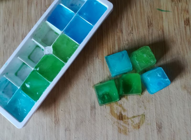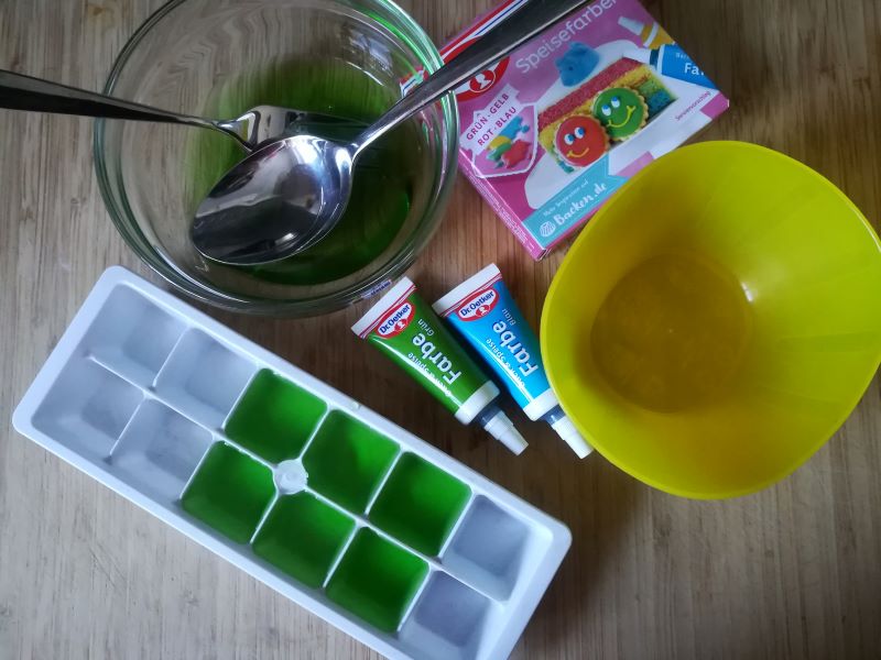 Was wir brauchen: – Lebensmittelfarbe (mindestens zwei unterschiedliche Farben) – Zwei kleine Schüsseln – Eine kleine Gabel – Einen großen Löffel – Eine Eiswürfelform – Wasser – Platz im Gefrierschrank – Ein Brett |