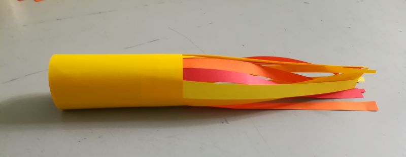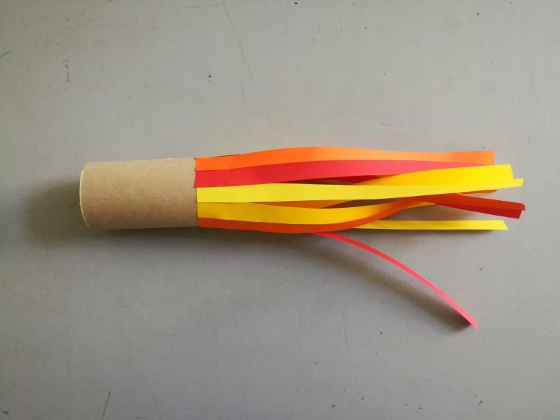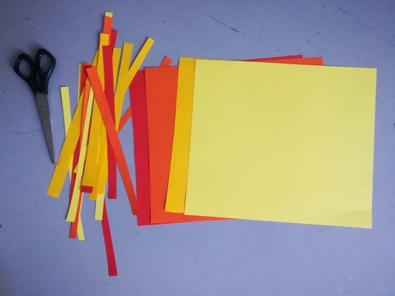 Als erstes schneiden wir uns gleichlange Streifen vom bunten Papier ab. Da ich meine Rakete in Rot- und Gelbtönen gestalten wollte, habe ich vier unterschiedliche Farben genommen. |
