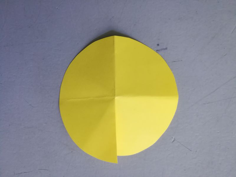 Wir zeichnen uns einen mittelgroßen Kreis (Radius ungefähr 6 cm) auf ein Stück Papier, schneiden diesen Kreis aus und falten ihn zweimal in der Mitte. Nun schneiden wir das Papier an einer der gefalteten Seiten bis zur Mitte ein. |