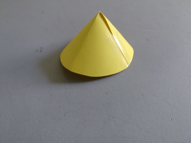 Anschließend falten wir daraus einen kleinen Hut und kleben ihn an der Seite zusammen. Im Anschluss kleben wir unseren Hut auf die obere Seite der Klopapierrolle. |