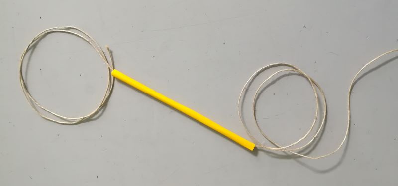 Wir fädeln die Schnur nun durch den Strohhalm und binden sie an einer Ecke im Raum fest. Das andere Ende der Schnur binden wir in einer anderen Ecke des Raumes fest. Wichtig hierbei ist, dass es einen Höhenunterschied gibt, das heißt, dass das eine Ende z.b. in der Nähe der Decke angebracht wird und das andere in der Nähe der Türklinke. |