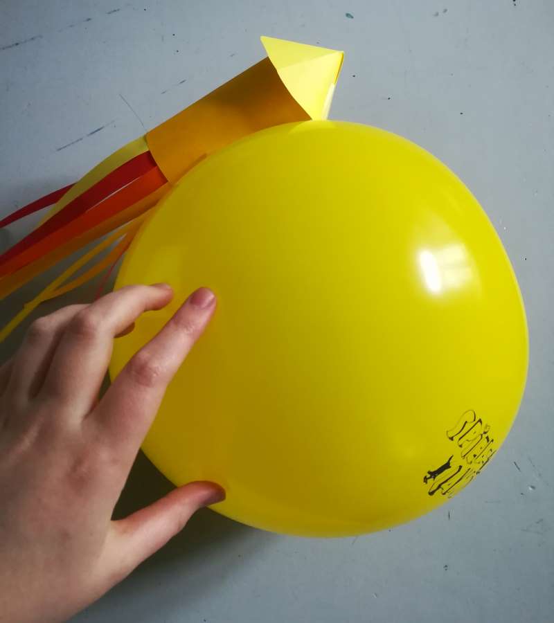 Als nächstes pusten wir unseren Ballon auf und verschließen ihn mit der Klammer. Dann kleben wir mithilfe des Klebebandes die Rakete auf den Luftballon. |