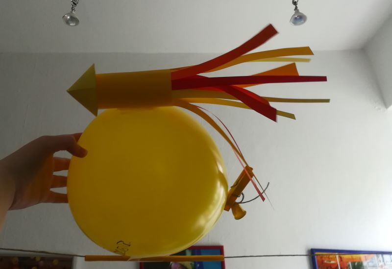 Zum Schluss kleben wir die Luftballonrakete an den Strohhalm mit dem Klebeband. Sobald wir die Klammer entfernen, kann unsere Rakete starten 🙂 |