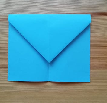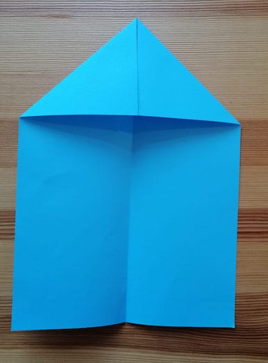 Falte das Papier einmal der Länge nach in der Mitte. Knicke dann die beiden oberen Ecken zur Mittellinie, sodass oben ein Dreieck entsteht.
