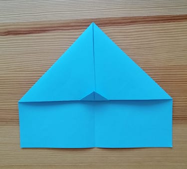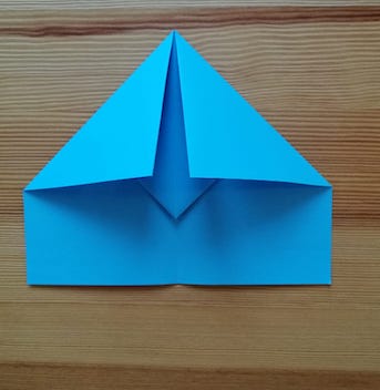 Falte den Flieger einmal in der Mitte. Danach werden die Außenkanten der Tragflächen parallel an die Unterkante des Fliegers gefaltet.