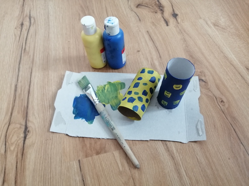 Male die beiden Toilettenpapierrollen mit der Acrylfarbe bunt an. |