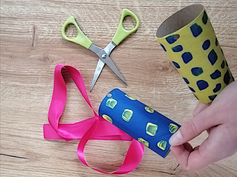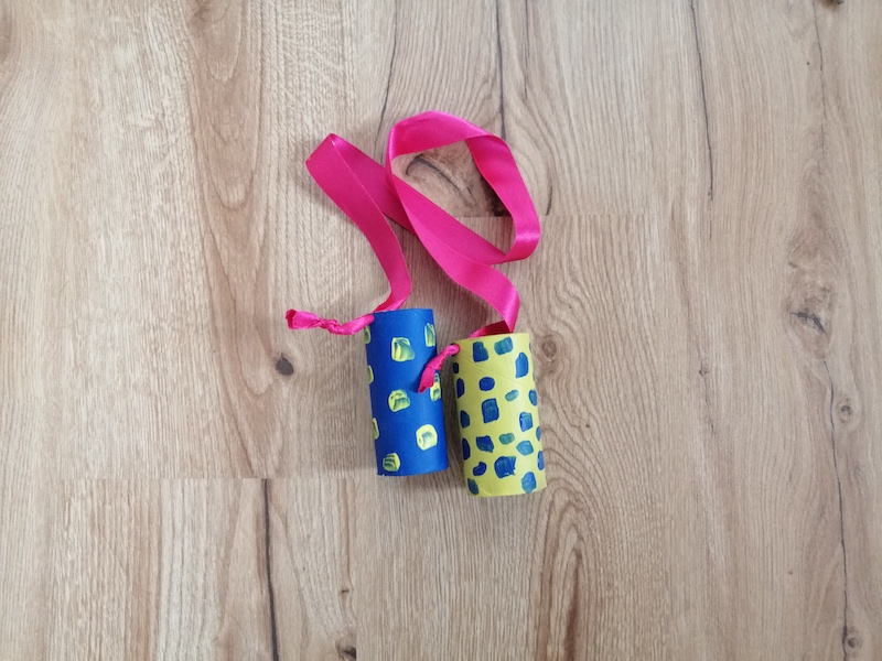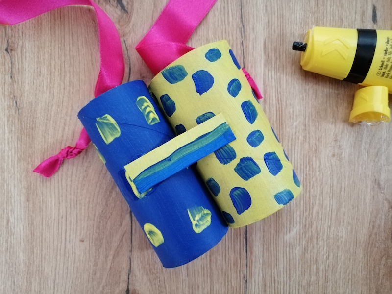 Material: 2 Toilettenpapierrollen, 1kleines Stück Tonpapier oder dünner Karton, Acrylfarben, Pinsel, Flüssigkleber, Schere, Band, Locher, Wäscheklammern (optional)