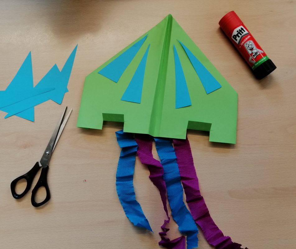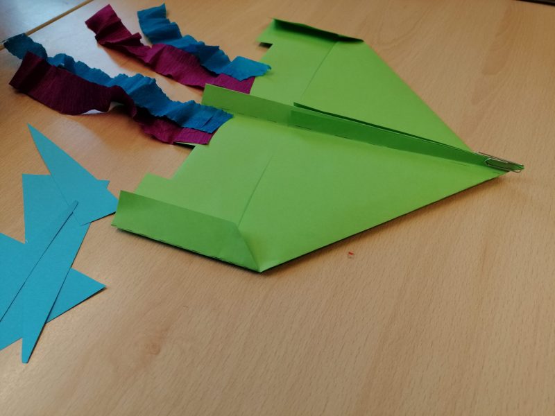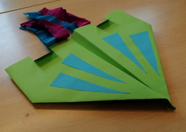Krepppapier macht sich gut als Verzierung des hinteren Teils des Fliegers, aber du kannst auch 1 cm breite Streifen aus Papier ausschneiden und unter die hinteren Flügel kleben. Beim Verzieren deines Fliegers kannst du deiner Fantasie freien Lauf lassen. |