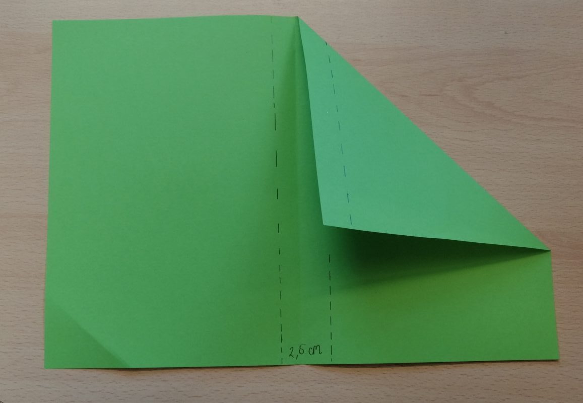 1. Lege den Papierbogen quer und falte ihn in der Mitte. Öffne ihn anschließend und falte die beiden oberen Ecken zur Mittelline.