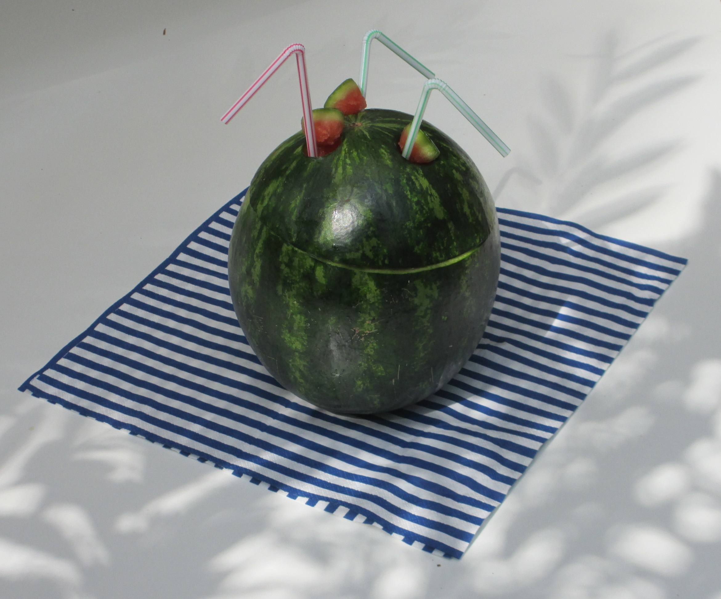 Für Strohhalme könnt ihr in den Deckel Löcher mit dem Kugelschneider oder einem Kernhausentferner bohren. Jetzt nur noch Eis und Saft in die Melone einfüllen und ihr habt stundenlange einen eiskalten Drink!
