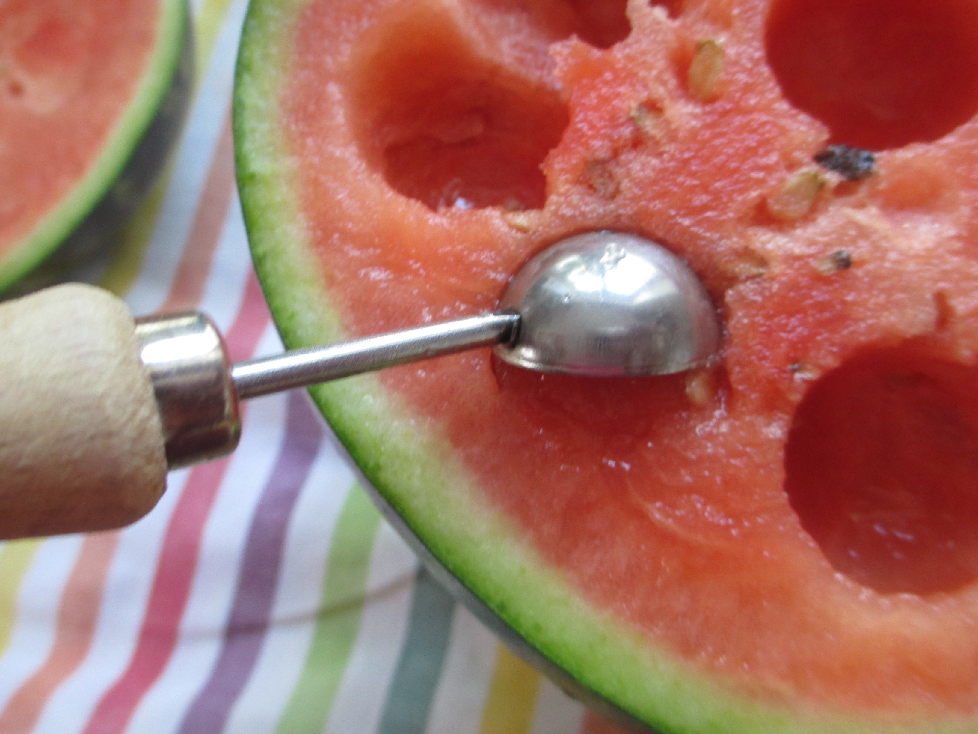 Jetzt geht es ans Aushöhlen. Das Fruchtfleisch könnt ihr mit einem Teelöffel, Eisportionierer oder dem Kugelschneider leicht aus der Wassermelone rausholen.