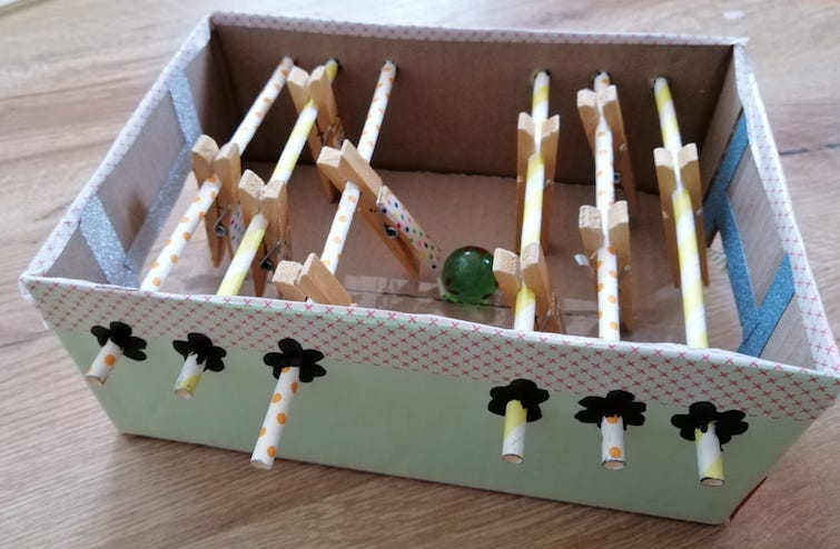 Jetzt musst du nur noch die Strohhalme durch die Löcher fädeln und die Klammern platzieren! Fertig ist dein Tisch-Kicker! Als Ball kannst du eine große Murmel oder einen Tischtennisball verwenden. |