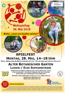 Mehr zum Hintergrund des Weltspieltags und dem diesjährigen bundesweiten Motto „Lasst uns draußen spielen!“ erfahren Sie auf den Seiten des Bündnis Recht auf Spiel.