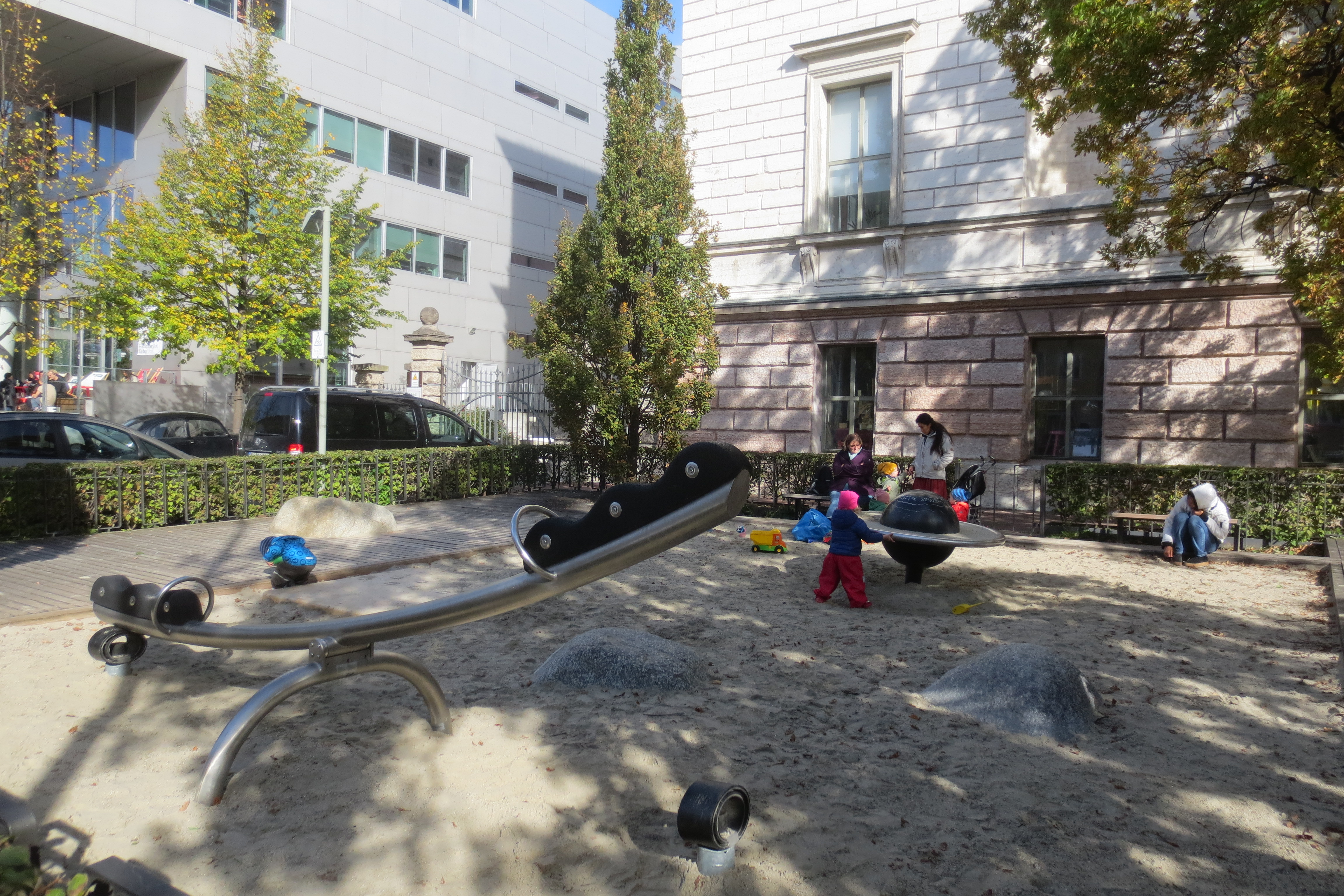 Der Platz wurde von unseren Spielforschern als „schön“ beurteilt. Ausstattung: Turm mit Rutsche, Kletterketten, zwei Wipptiere und Platz zum Fußball spielen. Spieltipp von André (6): „Eine Ameisenburg aus Sand bauen, mit ‚Futter‘ für Ameisen drin, z.B. Löwenzahnblätter.“
