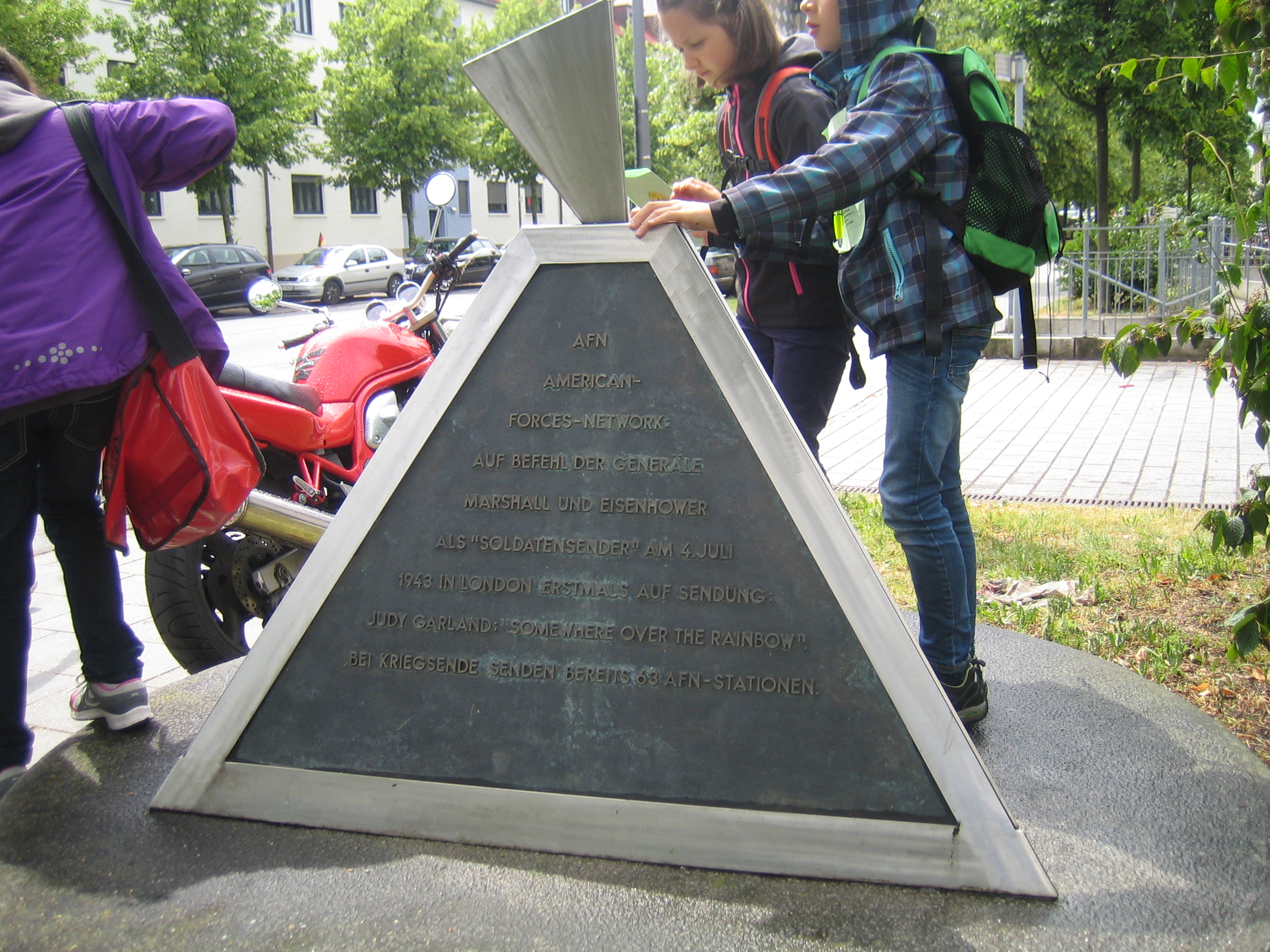 An der Soyerhofstraße Ecke Kastanienstraße steht ein Denkmal für die „American Forces Network“ (AFN). Das bezeichnet einen Radiosender, der während des 2. Weltkrieges für die amerikanischen Soldaten gegründet wurde. Zunächst entstand 1940 eine Radiostation der AFN in London, anschließend in Paris, dann in Frankfurt und 1945 kam München dazu. Die Stadtteilforscher aus Harlaching fanden heraus, dass das Denkmal, das wie eine kleine Pyramide aussieht, an den ehemaligen Sendeturm des Radiosenders erinnern soll.