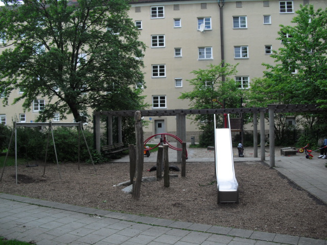 Hier befindet sich ein schöner Spielplatz mit Kletter- und Balanciermöglichkeiten. Natürlich gibt es auch eine Rutsche, Schaukeln und einen Sandkasten.