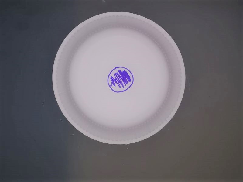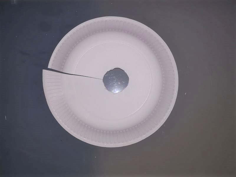 Den Kreis schneiden wir aus und machen zusätzlich einen Scherenschnitt von der Seite in die Mitte. Das Ganze machen wir jetzt mit den anderen Tellern genauso. Je mehr Teller wir machen, desto länger wird die Bahn. Aber passt auf: Die beste Länge liegt zwischen 4- 6 Tellern, da sich die teller sonst zu nahe kommen und die Murmel nicht mehr von einer Ebene zur nächsten kullern kann. |
