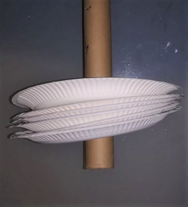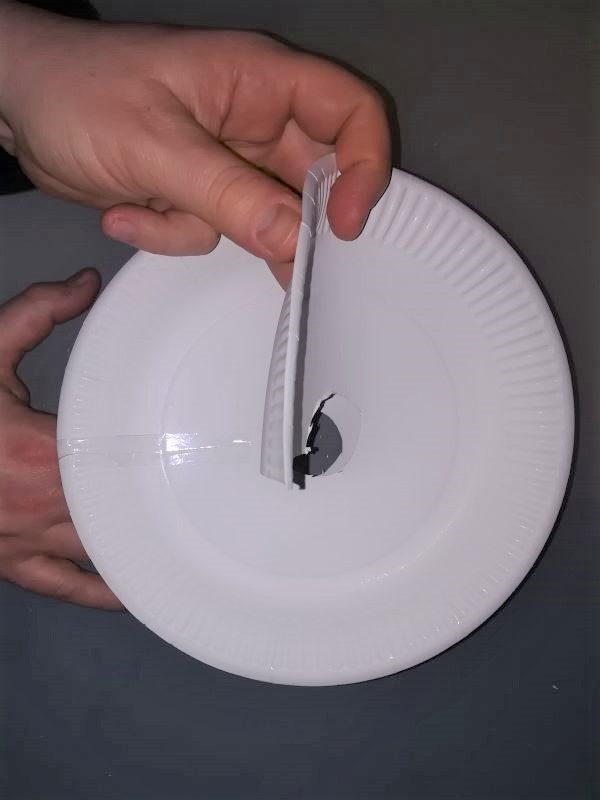 Als nächstes kleben wir die Teller zusammen. Dazu benötigen wir den Tesafilm. Am besten überlappen wir die Teller ein wenig, damit sie besser zusammen halten und kleben sie einmal auf der unteren und einmal auf der oberen Seite mit dem Tesafilm zusammen. |