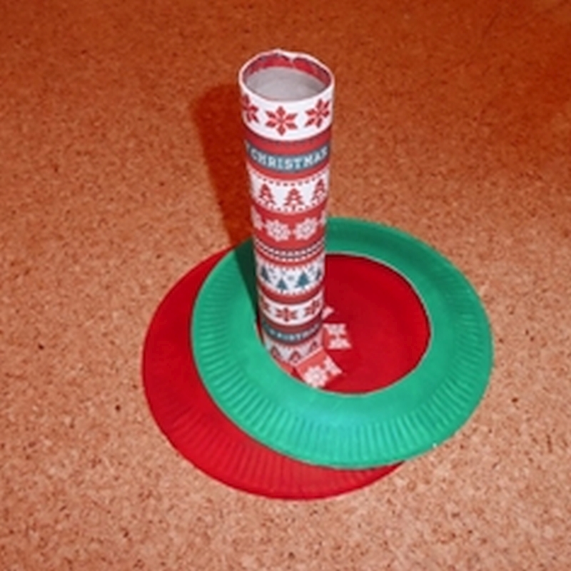 Jetzt nimmst du die Küchenrolle und den Pappteller, der noch ganz ist. Die Küchenrolle stellst du in die Mitte des Tellers und klebst sie einfach mit Tesafilm fest. |