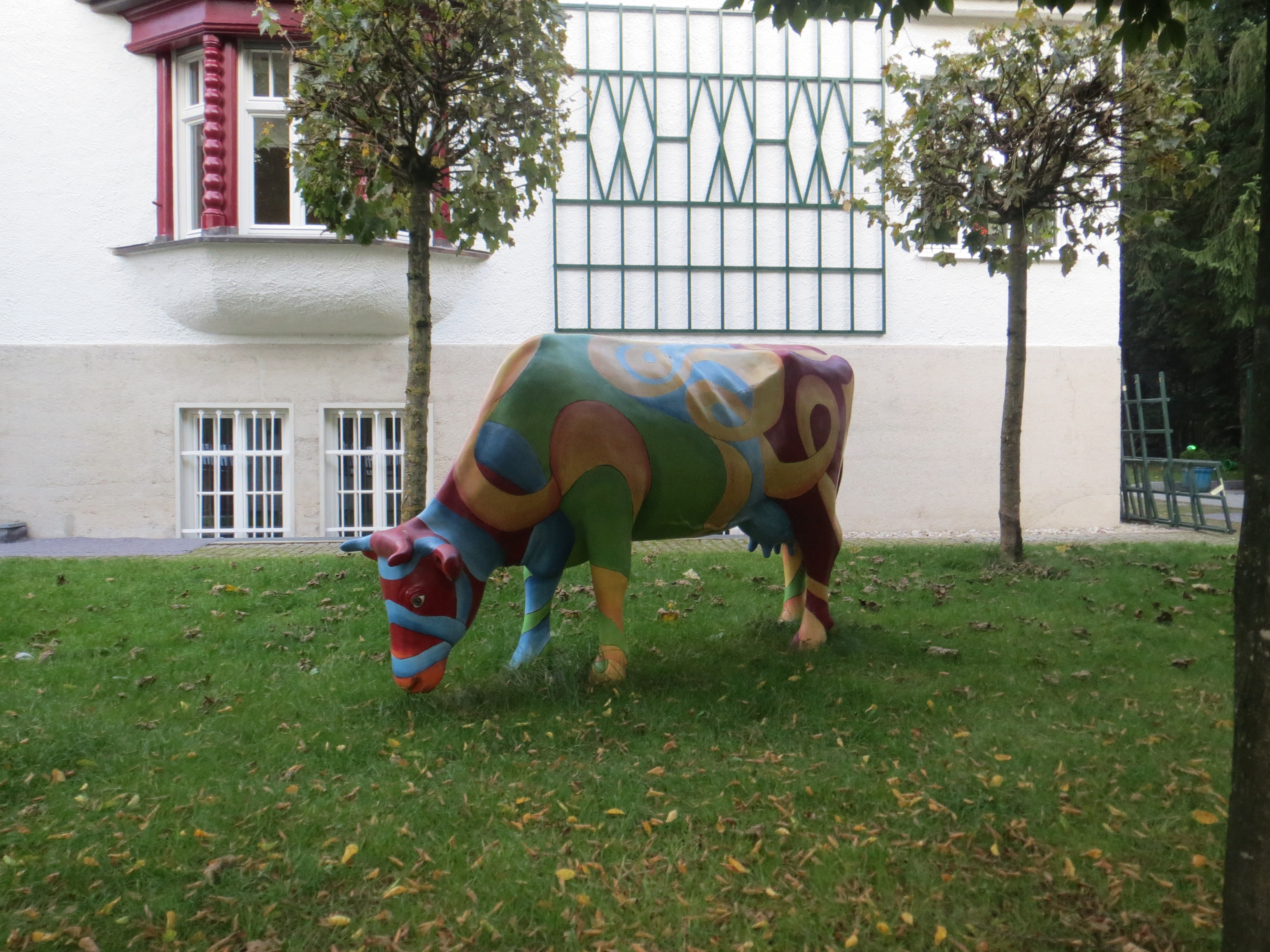 In der Benediktenwandstraße 17. Mimi (6) findet die Kuh sehr witzig, weil sie mit vielen Farben gestaltet ist.