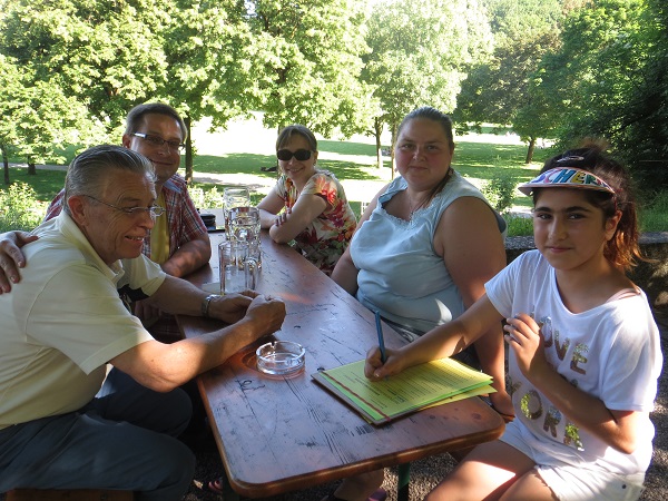 Melanie (10) führte ein kleines Interview mit einem der Biergartenbesucher, der 1978 in den Stadtteil Sendling-Westpark gezogen und auf die gleiche Schule wie sie gegangen ist. Er findet, dass der Westpark ein toller Stadtteil für Kinder ist, da es sehr grün ist und Kinder viele Möglichkeiten haben draußen zu spielen. Er findet es jedoch schade, dass Kinder nicht in Wohnanlagen spielen dürfen.