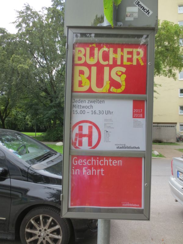 Hanna (9), Sara (8), Tiffi (9), Tuana (9), Monika (9) und Lana (9) haben auf ihrer Spielplatzforschertour die Haltestelle des Münchner Bücherbusses entdeckt. Der Bus hält hier mittwochs von 15:00 – 16:30 und bietet dir die Möglichkeit Bücher, CDs, DVDS, Blu-rays und auch Computerspiele aus zu leihen.