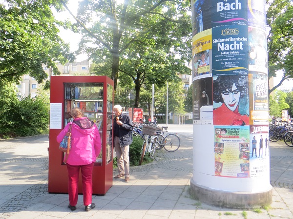 Neben der Litfaßsäule am Partnachplatz steht ein Bücherschrank. Dieser ist für alle rund um die Uhr öffentlich zugänglich. Du kannst dir die Bücher rausnehmen, lesen, aber auch alte Bücher von dir, die du nicht mehr brauchst, reinstellen.