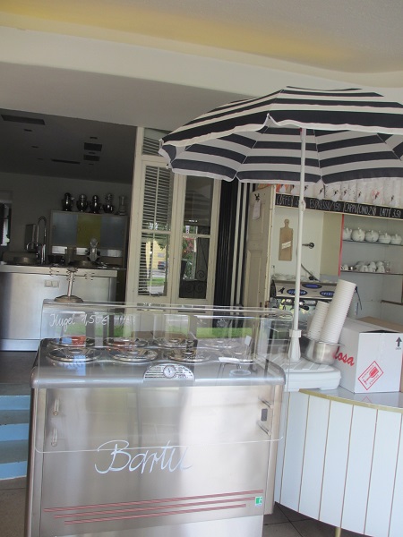 In dem Café gibt es nur im Sommer Eis. Neben Eis kannst du im ganzen Jahr auch Kuchen oder kleine Gerichte essen. Du kannst draußen sitzen oder drinnen. Unsere Forscher finden, dass die Stühle und Tische lustige aussehen, weil sie aus einer anderen Zeit stammen. Der Verkäufer im Laden hat ihnen gesagt, dass der Laden im Stil der 50er Jahre eingerichtet ist. Den Forschern gefällt das sehr gut. Außerdem finden sie es toll, dass über dem Eistisch ein großer weiß-blau gemusterter Sonnenschirm aufgeschlagen ist. Das sieht ein bisschen so aus, wie ein Eiswagen im Freien.