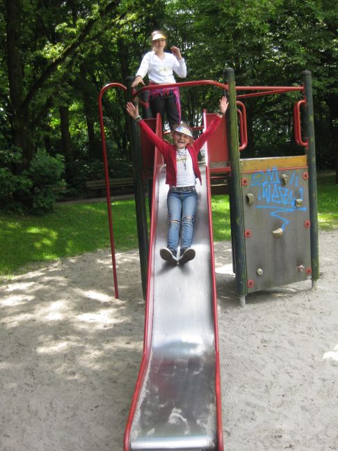 Um den Spielplatz herum laden viele Büsche und Bäume zum Klettern und Verstecken ein. Dort gibt es Wippen und ein Kletterhäuschen mit einer schnellen Rutsche.