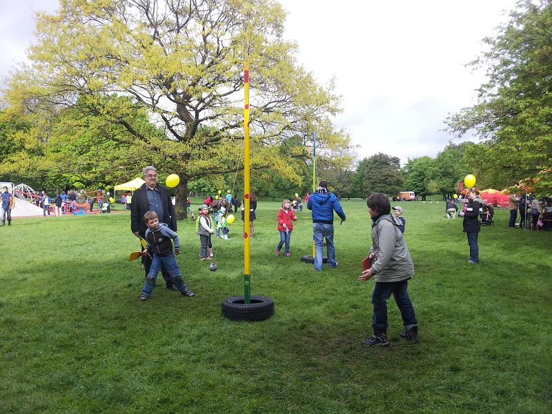 Die Aufbauarbeiten mussten wegen starken Schauern unterbrochen werden. Doch am Ende standen schließlich alle Stände, die auch bei Regen möglich waren pünktlich um 14.00 Uhr zur feierlichen Eröffnung. Alle Besucherinnen und Besucher versuchten, mit tatkräftiger Unterstützung des Trommobils, durch einen Regentanz die Regenwolken zu vertreiben. Der Tanz zeigte seine Wirkung allerdings erst ab ungefähr 16.00 Uhr. Bis dahin konnten Kinder einige Spielaktionen unter Pavillons und im großen Zelt nutzen. Um 16.00 Uhr hörte es auf zu regnen und die Luftballonstation konnte endlich mit ihrer Arbeit beginnen. Die gelben Luftballons verteilten sich schon in wenigen Minuten auf dem Gelände im Hirschgarten.
