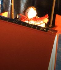 Der Zauberer zaubert sich ein großes Buch herbei.