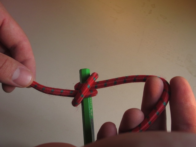 Erst macht man eine Schleife. Das Ende vom Zelt kommend muss oben sein (bei uns im Bild das Obere)