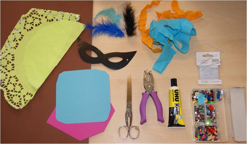 Suche dir Materialien, mit denen du deine Maske verzieren möchtest.