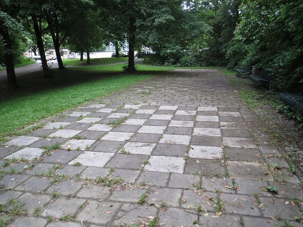 Wenn du von der Fernpaßstraße aus in den Westpark gehst, dann kommst du beim Eingang in den Park an mehreren Schachfeldern vorbei. Sie sind ungefähr 3 x 3 Meter groß und mittlerweile schon etwas von Gras bewachsen. Figuren gibt es hier leider keine. Aber vielleicht fallen dir auch andere Spiele ein, die du auf den schwarz-weiß karierten Steinen spielen kannst!