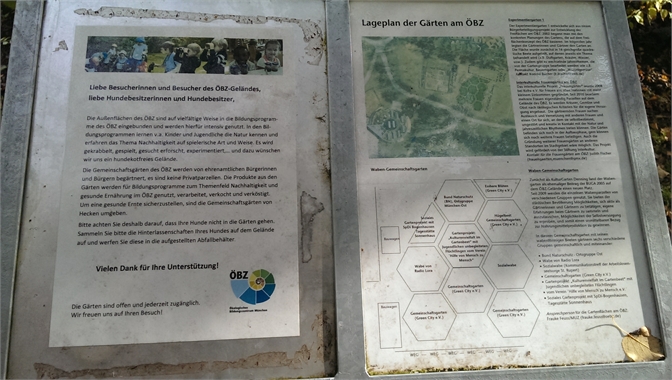Rund um das ÖBZ gibt es mehrere Gärten. Beim Garten mit dem großen Weg kannst du dir verschiedene Pflanzen anschauen und viel über die einzelnen Gewächse und ihre Verwendung erfahren. Im Garten mit den Wegen aus Ziegelstücken findest du Bienenstöcke, ein Gewächshaus, ein Insektenhotel, einen Teich und einen Kräutergarten. In allen Gärten kann jeder den Gärtnern, die sich freiwillig um die Pflanzen kümmern, bei der Arbeit zusehen und sie befragen.