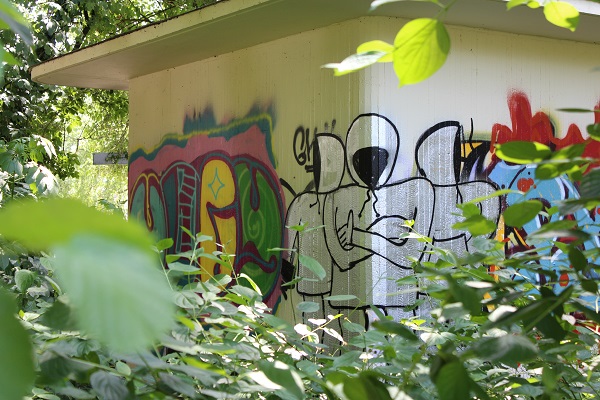 Auf einem Elektrohaus am Krüner Platz haben unsere Forscher ein interessantes Graffiti gefunden. Es liegt etwas versteckt zwischen Gebüsch und Bäumen.