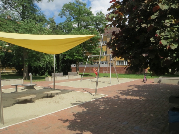 Die Wohnanlage am Hochvogelplatz besitzt einen sehr schönen Innenhof. Dort stehen zwei Tischtennisplatten. Daneben steht ein neu gebauter Spielplatz. Dort kannst du entweder schaukeln, im Sand spielen oder dich im Sommer an der Wasserpumpe abkühlen. Der Sandkasten ist auch für Kleinkinder gut geeignet, da er mit einem Segel überdacht ist.