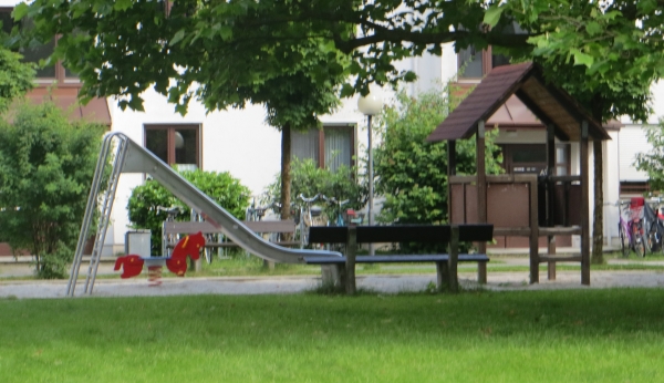 Er schaut hinter einer Hecke hervor. Auf dem Spielplatz gibt es außerdem ein Häuschen, eine Rutsche, Pferdchen sowie eine Tischtennisplatte.