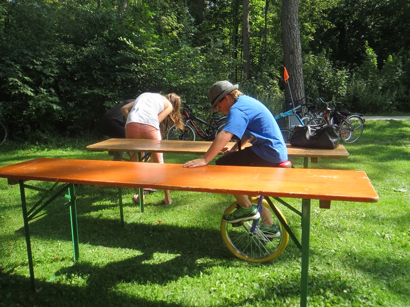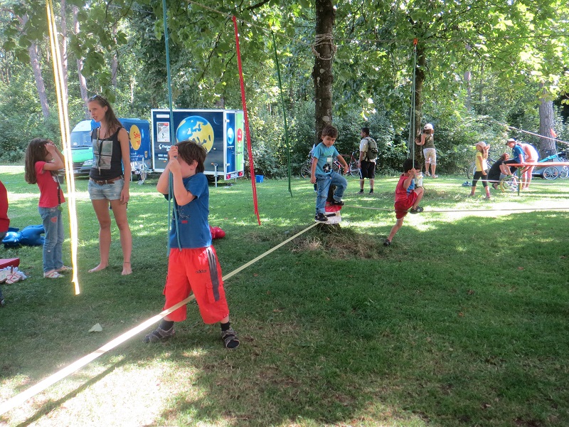 Hier gibt es eine Slackline auf der man das Gleichgewicht trainieren kann. Außerdem kannst du hier noch Einrad fahren üben oder auf der Bewegungsbaustelle Hindernisse überwinden.