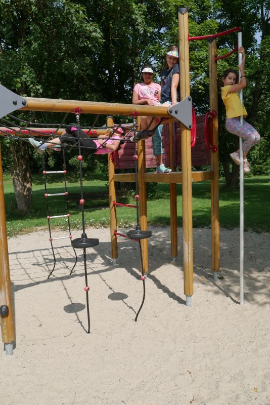 rzeugte die Spielplatzforscherinnen Tiffi (9) Hanna (9) Sara (8) Lana (9) Monika (9) und Tuana (9) wegen der großen Wiese die zum Toben, Turnen und Picknick machen einlädt. Es gibt ein kleineres Spielgerät mit Kletternetzen, Feuerwehrstange und Tellerschaukeln. Neben diesem Spielgerät kannst du auf einem tollen ausladenden Kletterbaum klettern. Weiter hinten auf der Wiese ist noch ein größeres Spielgerät aufgebaut auf dem du klettern, rutschen und balancieren kannst. Die Mädchen mögen auch die beiden Schaukeln, weil du hier besonders hoch schaukeln kannst.