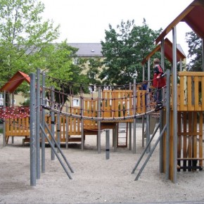 Auf dem Athener Platz gibt es einen Spielplatz mit einen großen Klettergerüst, einer wackeligen Hängebrücke, auf der man auch hüpfen kann, einer Rutsche und einer Kletterwand.