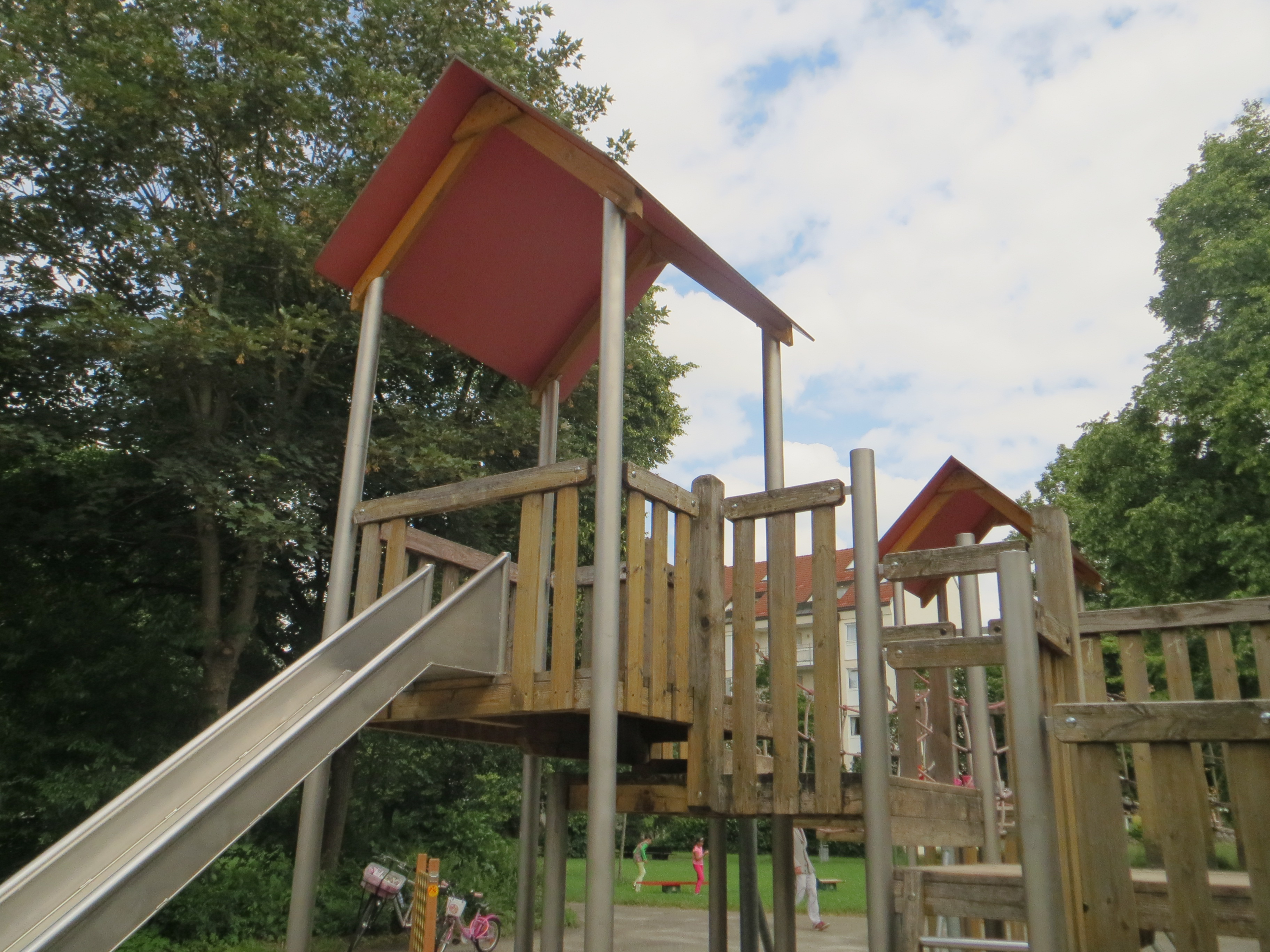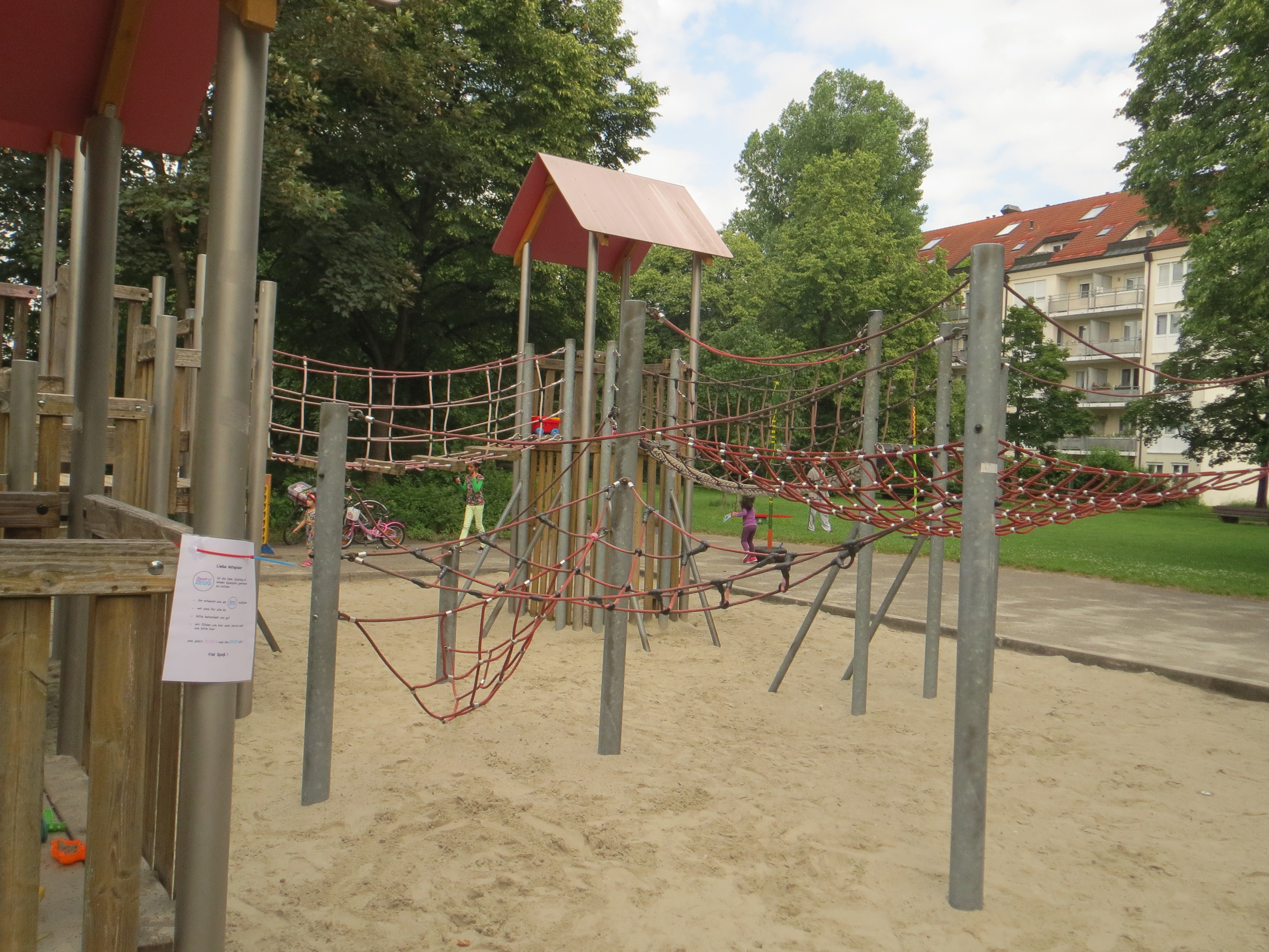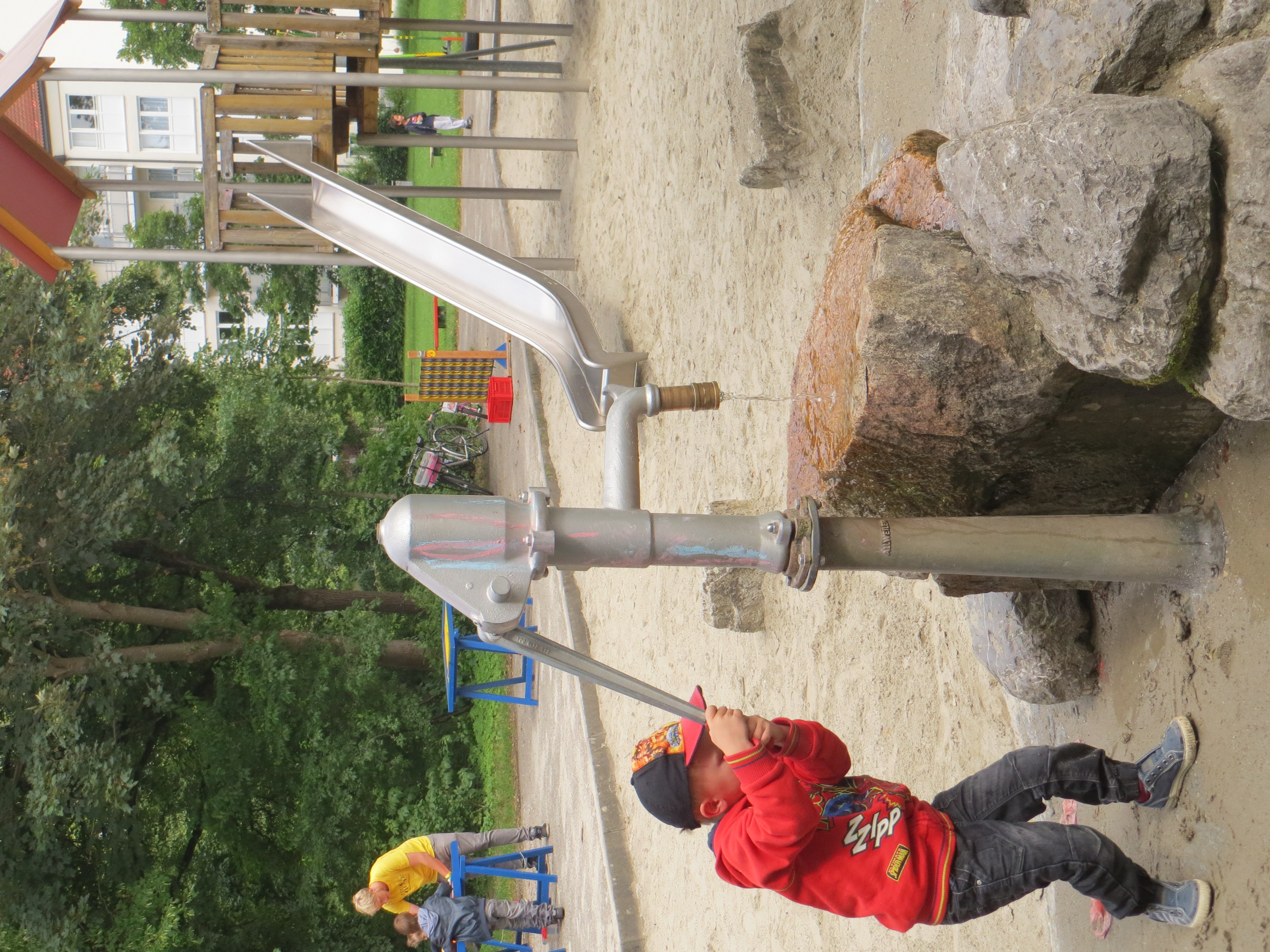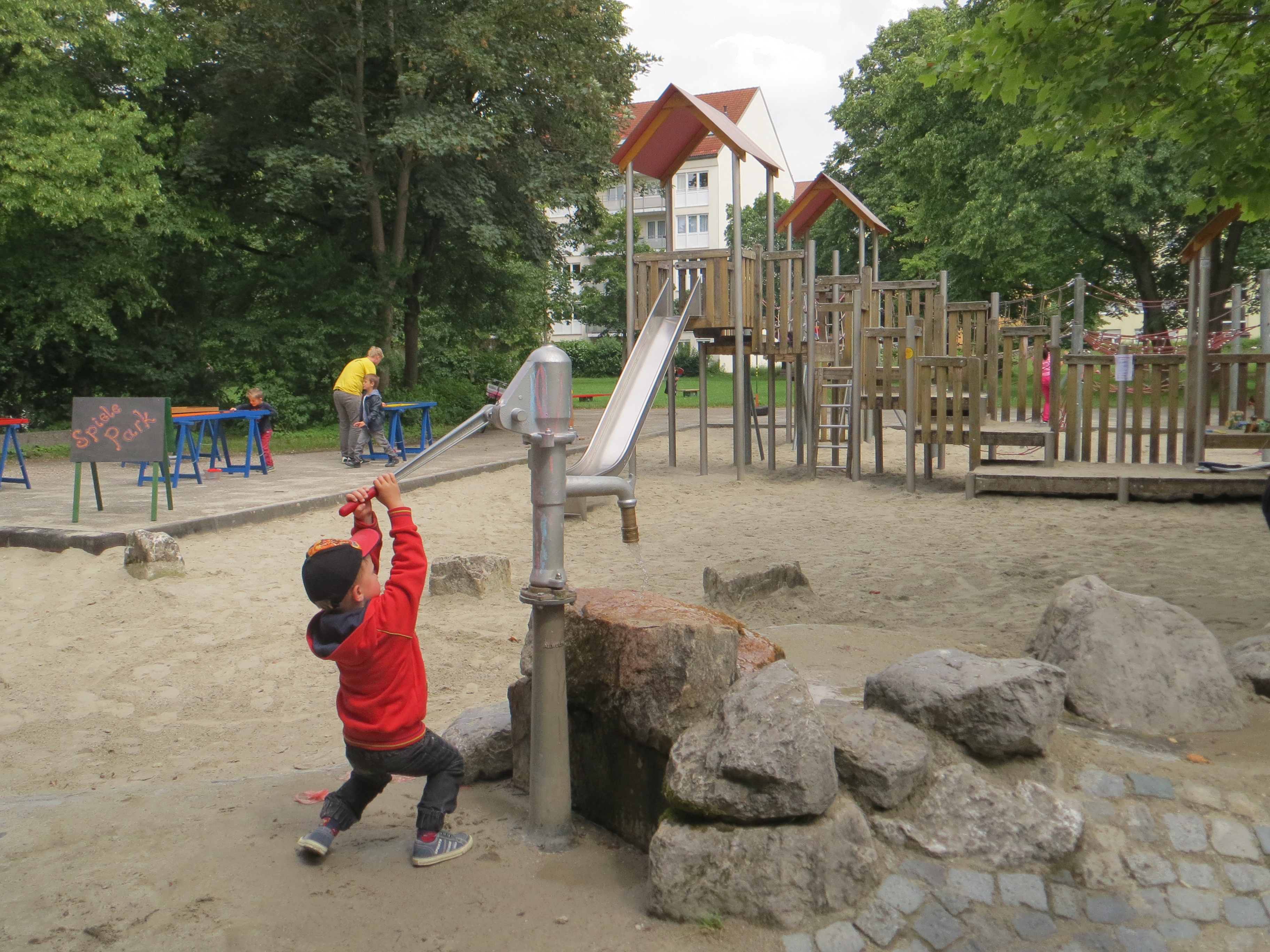 Es gibt ein großes Klettergerüst mit zwei Türmchen, viele Netze zum Klettern sowie eine Rutsche. Am liebsten klettert Leni (5) auf den Netzen herum, denn hier fühlt er sich wie Spiderman. Die Rutsche findet er zu langsam. Luka (5) hingegen spielt gerne an der Wasserpumpe.