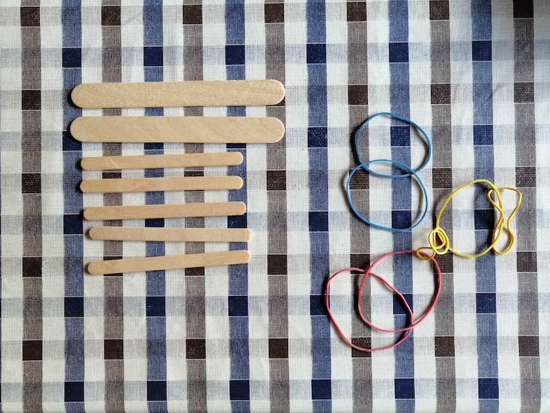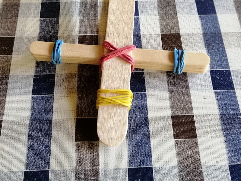 Staple die fünf kleinen Holzstäbchen aufeinander und binde sie links und rechts mit jeweils einem Gummiring zusammen. Dann legst einen großes Holzstäbchen quer unter den Stapel kleiner Stäbchen und ein großes Holzstäbchen quer auf den Stapel kleiner Stäbchen. Jetzt hast du ein Kreuz aus Stäbchen vor dir liegen. |