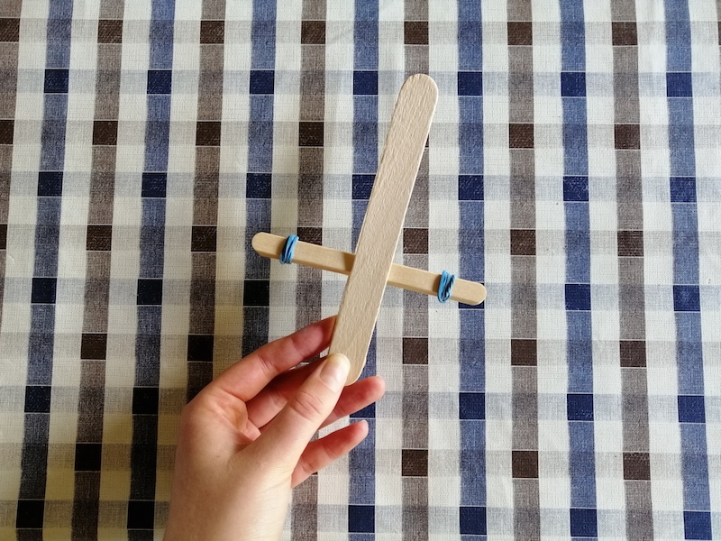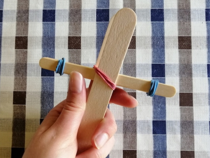 Verbinde das Konstrukt mit zwei Küchengummis, die du jeweils diagonal um die Kreuzmitte wickelst. Jetzt wickelst du noch drei Küchengummis um das untere Ende des Katapults, damit alles fest zusammenhält. |