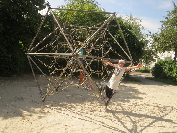 Abraham findet, dass die Kletterspinne gut ist, um klettern zu üben. Aftandil findet es ganz schön wackelig, weil manche Seile nicht so gut gespannt sind. Emily fände es schöner, wenn sie noch etwas bunter wäre. Insgesamt finden sie es schade, dass dort so wenig zum Spielen steht. Es gibt zwar einen Sandkasten, die Kletterspinne und eine lange Wiese, aber mehr Spielgeräte gibt es leider nicht. Die Forscher schlagen vor, noch Schaukeln oder eine Rutsche anzubringen.