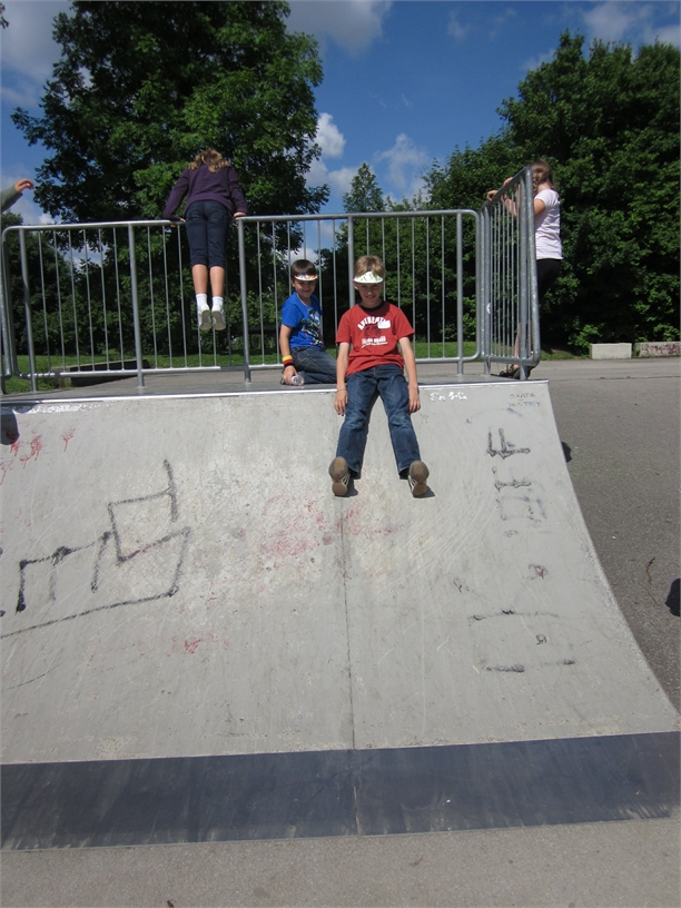 Zum Spielplatz führt ein Geheimgang bis hin zur Rampe für Skater und Waver. Der Platz hat zwei Tore und zwei Basketballkörbe. Die Tischtennisplatte ist nicht weit weg.