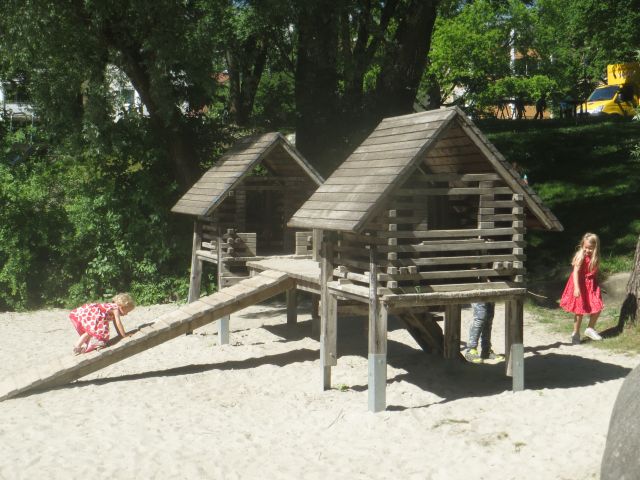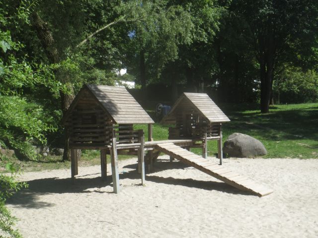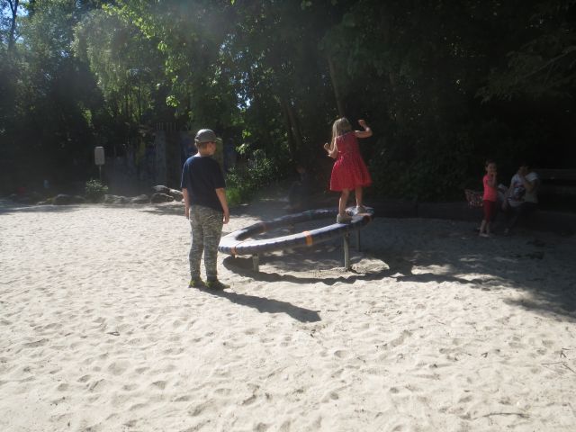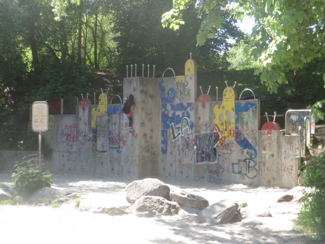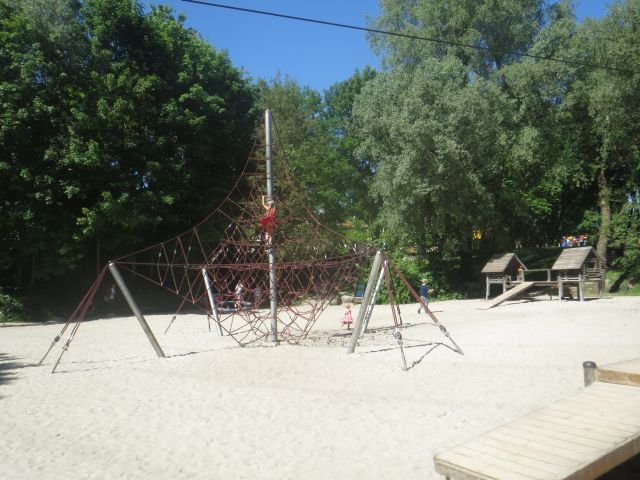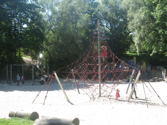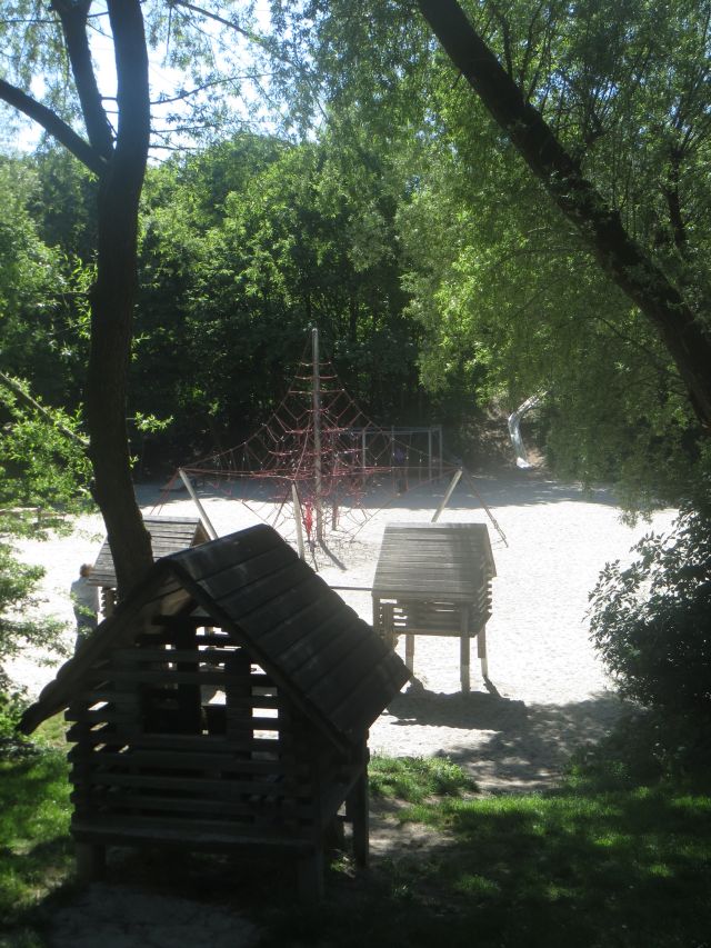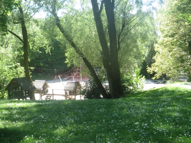 Nach Meinung der Stadtteilforscher Tim (8) und Emir (9) ist der Abenteuerspielplatz einer der schönsten Spielplätze im Stadtteil: es bietet Spielspaß für groß und klein und liegt mitten im Park in einem Tal. Eine lange kurvige Rutsche führt direkt in den großen Sandkasten. An einer großen Klettterwand kannst du mit unterschiedlichen Schwierigkeitsstufen klettern: der einfachste Weg ist blau und der Schwierigeste ist rot gekennzeichnet. Mit der Seilbahn kannst du dich einmal über den ganzen Platz schwingen oder auf den im Kreis angeordneten Reifenschaukeln zu sechst toben. Ein riesiges Kletternetz in der Mitte des Spielplatzes sieht laut Derya (12) aus wie ein Spinnennetz und bietet richtig viel Platz zum Klettern. Drei kleine Holzhäuschen auf Stelzen kann man sich toll verstecken oder sich „beratschlagen“, findet Mathilde (9). Unter den großen Bäumen drumherum sitzen gerne Eltern im Schatten.